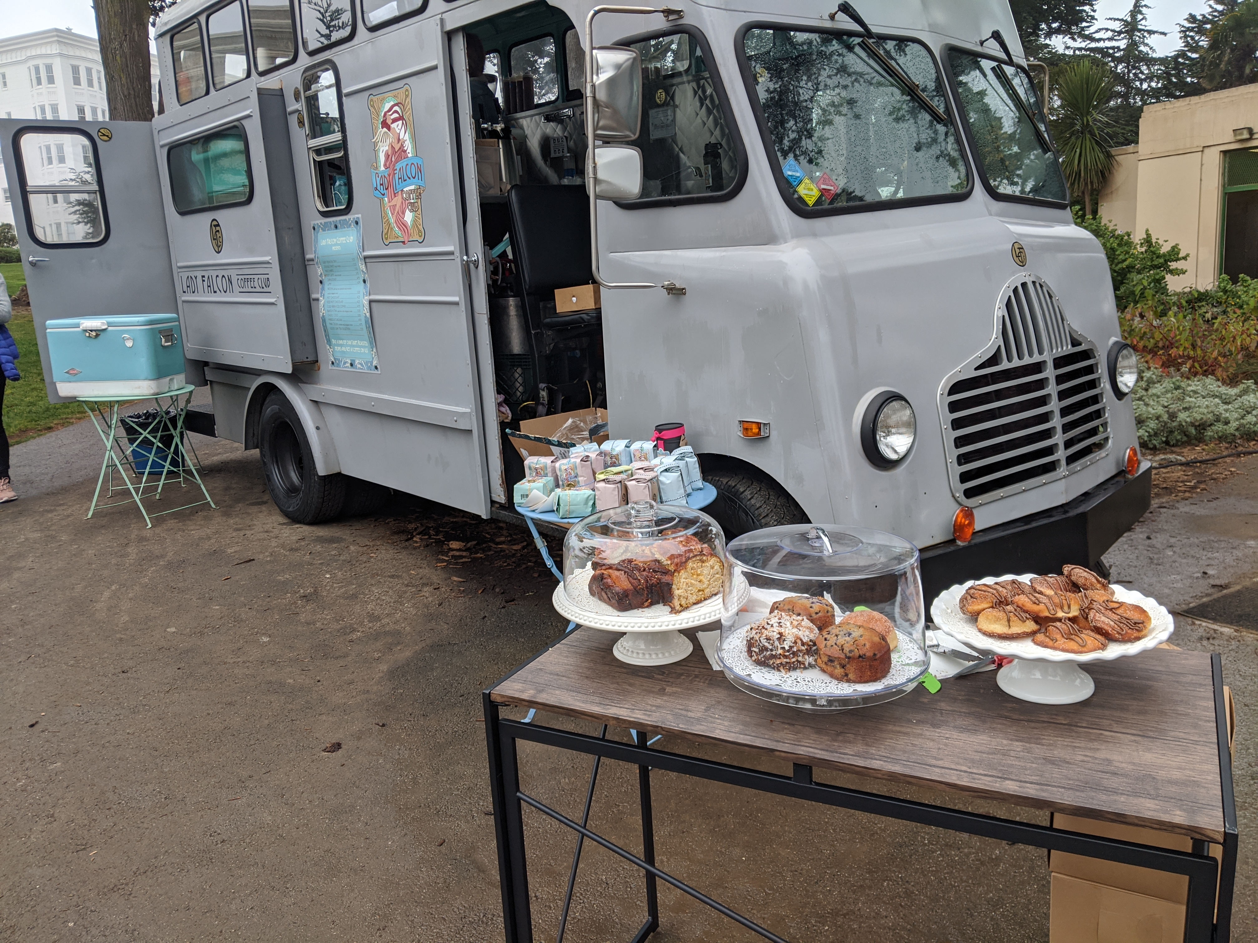 On my end, the past couple of months have had some exciting baking news! Back in November and just a week ago, I did a couple of weekend pop ups with Lady Falcon Coffee Club. If you haven’t heard of it, LFCC is an awesome woman owned coffee roaster based in the bay area. Their lovely coffee truck is usually located out of Alamo Square, and for a weekend in November and last Sunday, I set up a table with some sweet treats for people to grab and enjoy with their coffee.