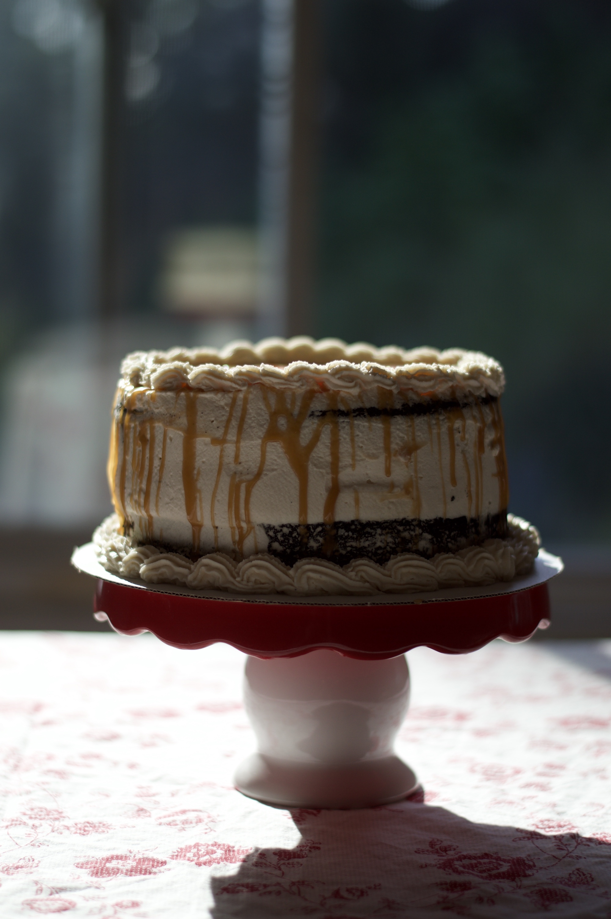 - After cakes have cooled completely (you can even freeze the layers before assembling to prevent crumbs), place one layer on cake board. Put on a generous layer of frosting. Put second layer on top. Proceed to frost outside of cake evenly. Pipe edges around the top and bottom of cake, and drizzle remaining caramel on top.