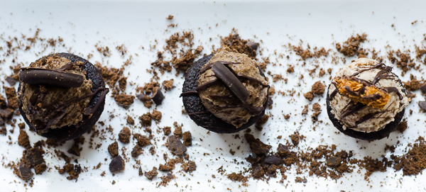 For the frosting, I take a basic Swiss meringue frosting recipe, then mix it with crushed cookies to get a cookies n’ cream frosting. Since the chunks in the frosting make it quite difficult to pipe, I used a cookie dough scoop to get a nice half dome of frosting on top of the cupcakes. To make them look festive, I added a quarter cookie on top of each and drizzled with melted dark chocolate.