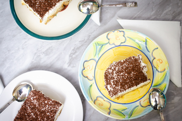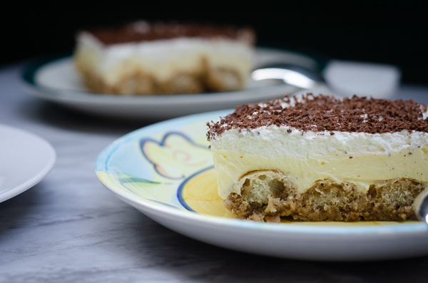 After that is the whipped cream and boozy coffee dipped ladyfingers - easy peasy! Then one tiny last step is where my version of the cake differs slightly from the classic. Instead of a dusting of cocoa, I grate dark chocolate over the cake to give it a touch more sweetness and richness.